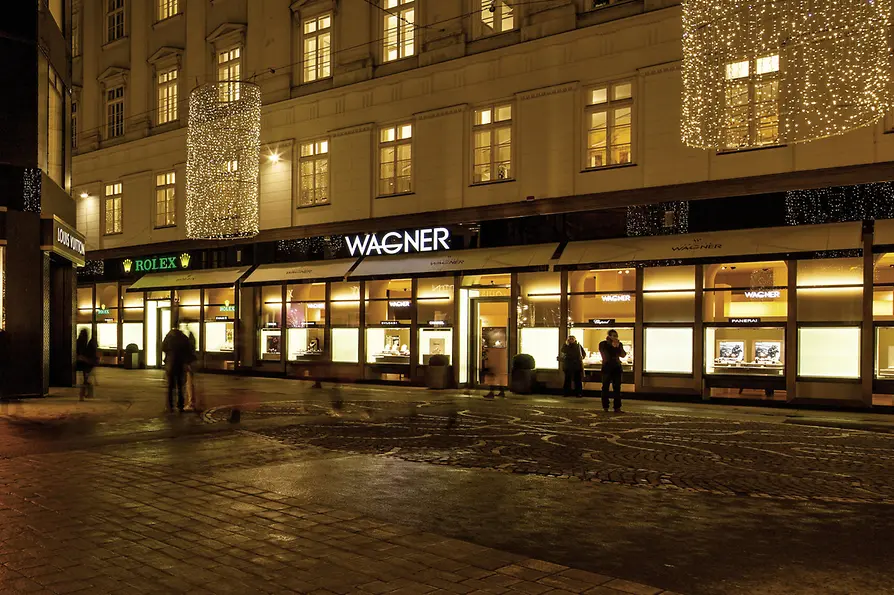 グラーベンとトゥフラウベン通りの角にオーストリア最大規模の高級貴金属店ワーグナーがオープンしました。700平方メートルにおよぶフロアーに独自デザインのアクセサリーや有名国際ブランドが並び、ロレックスブティックも話題を呼んでいます。