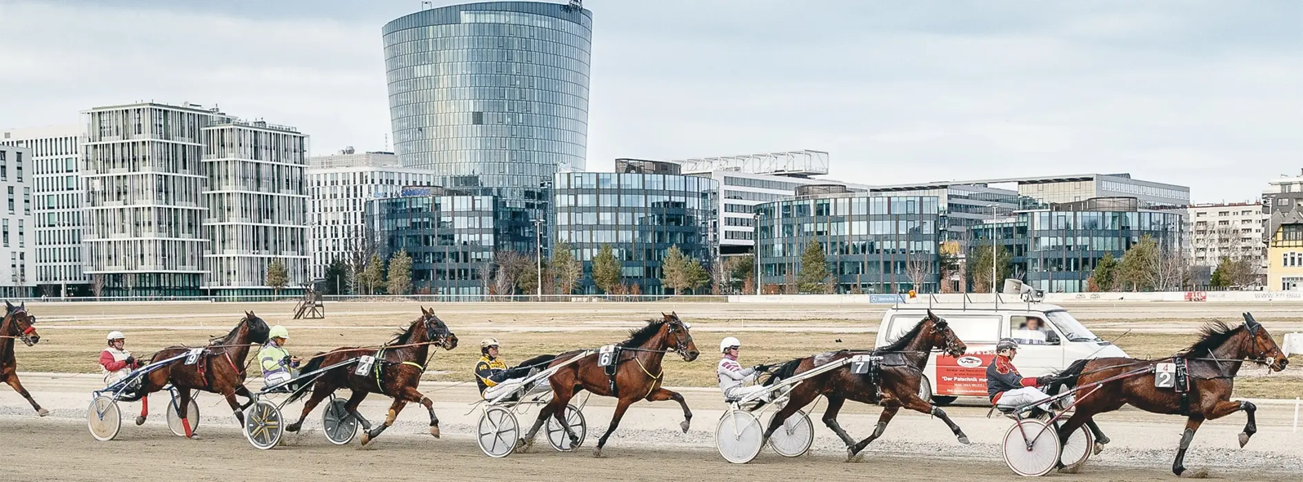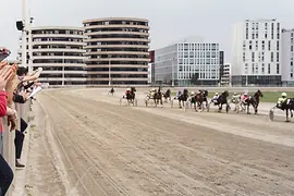 ギリギリに馬券を購入すると、「まもなく、次のレースがスタートします」というアナウンスがありました。外のコース近くに人が集まり混み合い、今までとは全く違った雰囲気に包まれます。コースの一方には、遠い過去の華やかな全盛期を彷彿させる歴史ある審判員の塔が建っています。その背後には、近年開発されたモダンなオフィスや住居が建つ2区の現代的な建物群が見えます。まもなく二輪馬車を曳く馬が大きな音を轟かせながら私たちの前を通過していきました。素人ではどの馬が最初にゴールラインを通過したか見分けがつかないスピードです。あちこちで歓声があがり、他からは大きなため息が聞こえてきます。観客の多くはすぐに馬券売り場のある建物の中に入って行きます・・・
