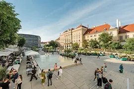Access to the terrace is free of charge and can be accessed via two outdoor lifts on the east side of the Leopold Museum. Last ascent at 21.30h