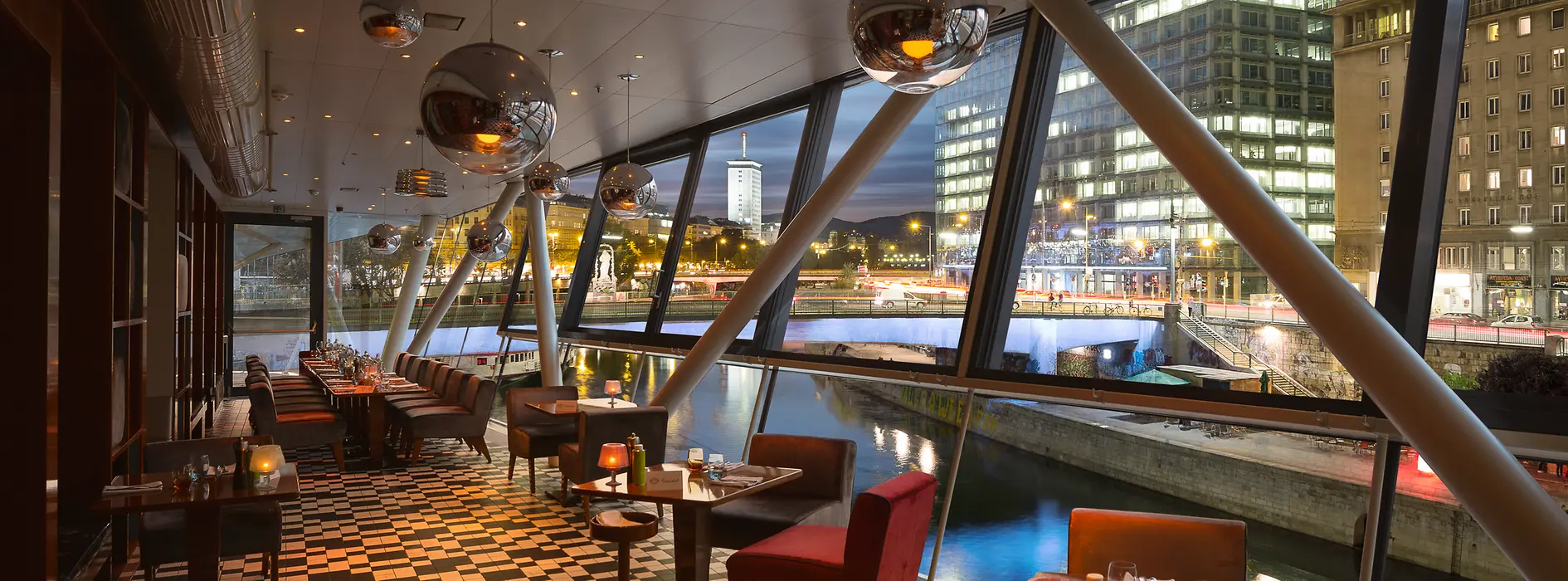 The "Motto am Fluss" lies on the Danube Canal like a sleek speedboat, right by Schwedenplatz, and is also the mooring point for the Twin City Liner. Arranged on two levels are an attractive restaurant reminiscent of the Venetian style of the 1950s as well as a cozy café with terrace.