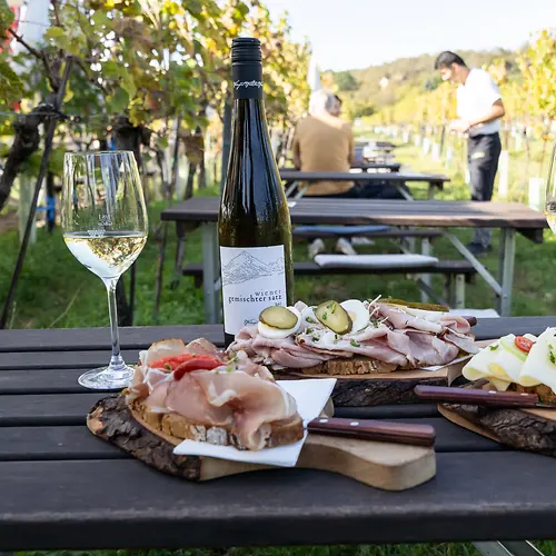 Richard Lentner harvests only the best grapes for his award-winning wines from the vines that grow on the loamy soil at the foot of the Bisamberg. The house specialty is a wine made from the blue grapes Zweigelt, Pinot Noir and Cabernet, which are pressed immediately after the harvest. A generous buffet provides the ideal accompaniment.